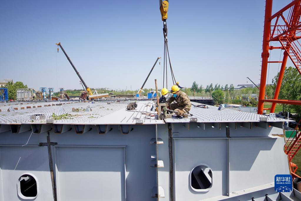 4月29日,工人在石家莊市學(xué)府路東延跨太平河橋主橋合龍現場(chǎng)施工。