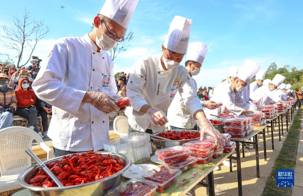 4月29日,廚師在盱眙縣第一山歷史文化街區準備免費派發(fā)小龍蝦。