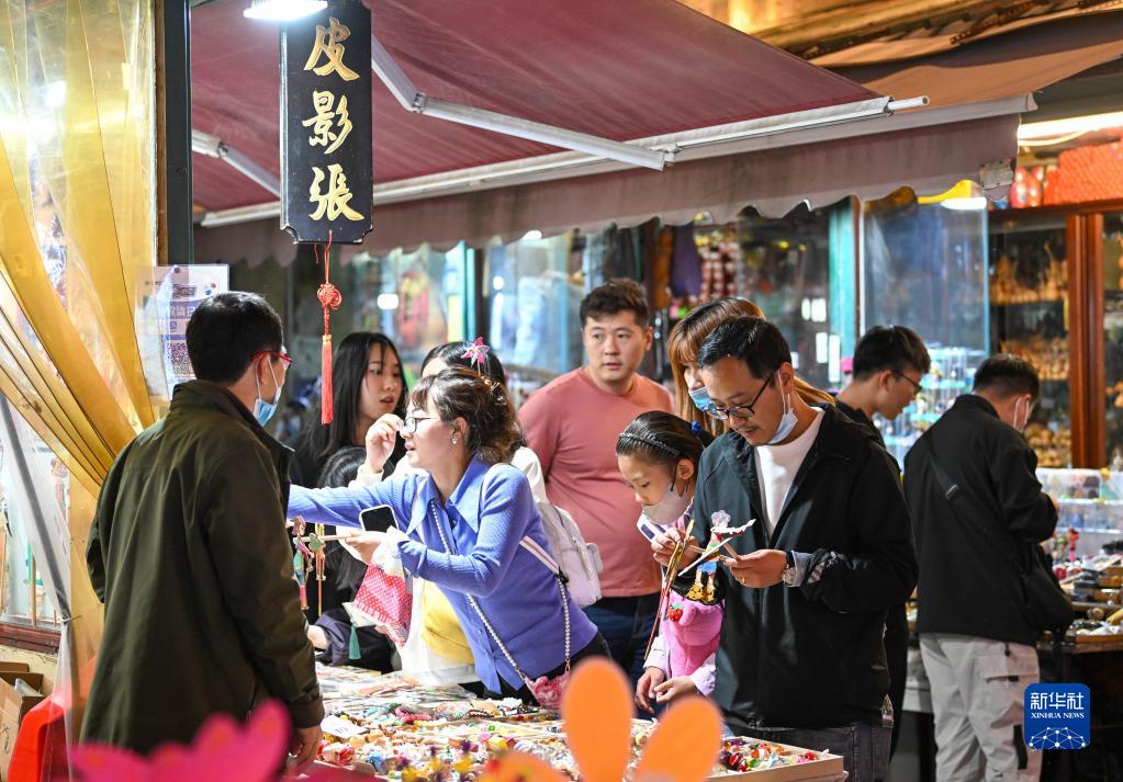 4月29日晩,游客在天津古文化街一店鋪選購商品。