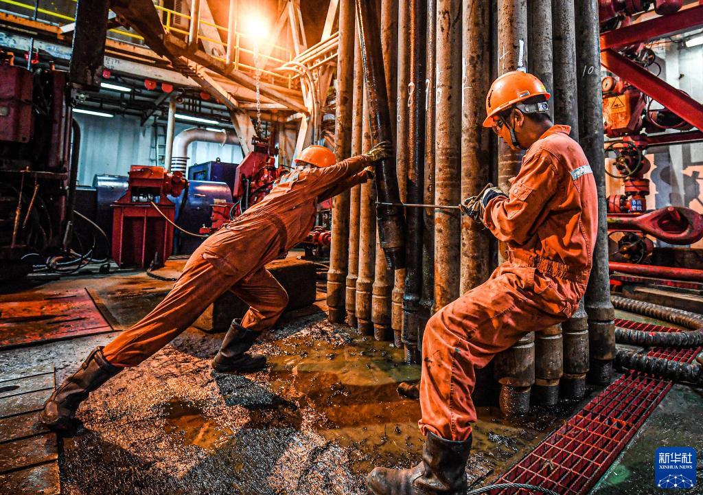 在位于南海北部海域的勘探三號鉆井平臺上,鉆井工人在擺放鉆桿(2020年7月26日攝)。