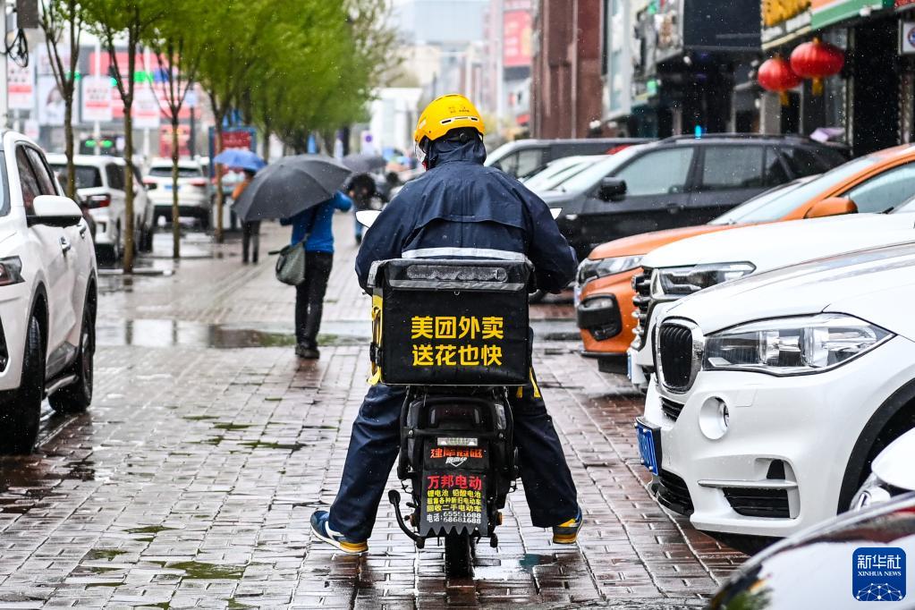 在吉林省吉林市,一名外賣(mài)小哥在雨中配送外賣(mài)(2023年4月28日攝)。