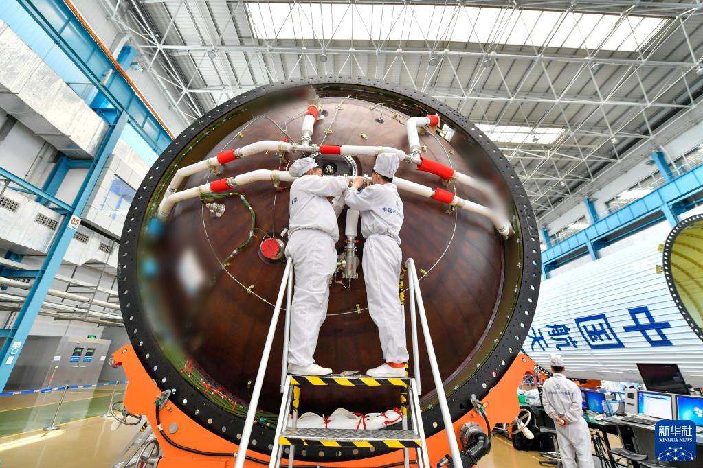 在航天科技集團一院天津火箭公司總裝測試車(chē)間,班組人員在進(jìn)行火箭裝配(2023年4月19日攝)。