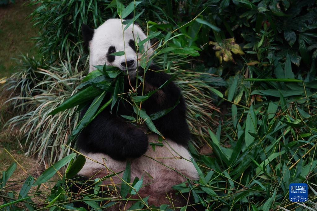 在香港海洋公園,大熊貓“樂(lè )樂(lè )”在吃早餐(4月19日攝)。