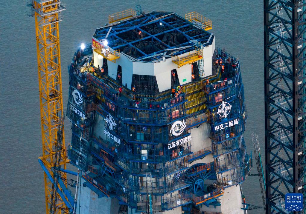 4月30日,中交二航局工人在常泰長(cháng)江大橋建設項目施工現場(chǎng)作業(yè)(無(wú)人機照片)。