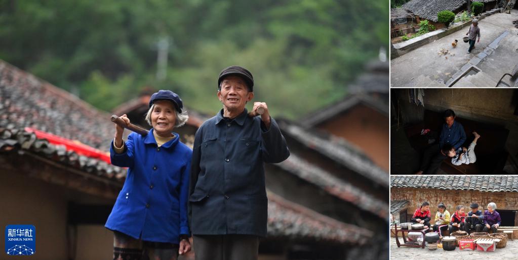 拼版照片:左圖為廣西融安縣東起鄉銅板屯85歲的老人龍顯星(右)和老伴巫福昭(2023年4月24日攝);右上圖為巫福昭在喂雞(2013年7月23日攝);右中圖為龍顯星和外孫女在一起(2013年7月24日攝);右下圖為龍顯星(右二)、巫福昭帶著(zhù)已經(jīng)長(cháng)大了的孫悲們賣(mài)土特產(chǎn)(2021年2月15日攝)。