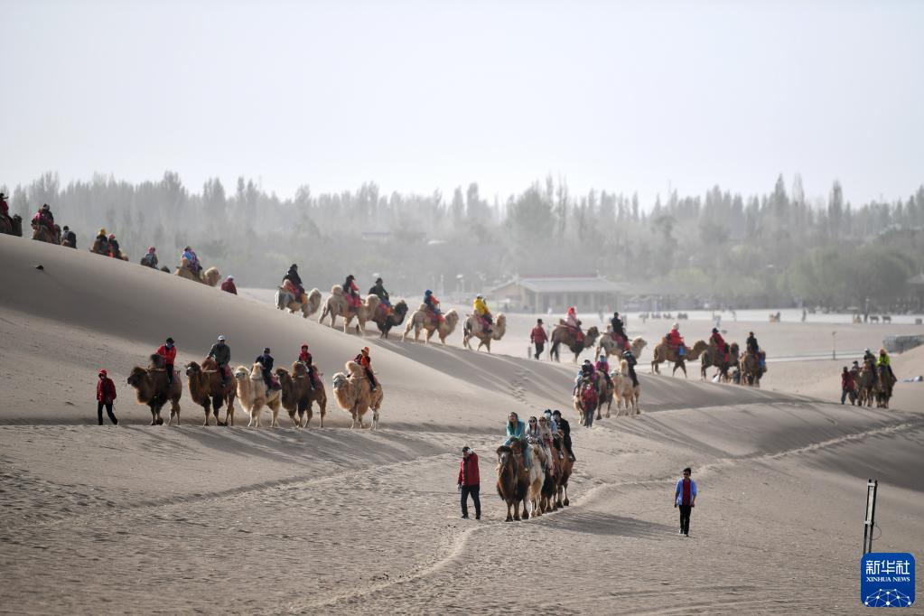 載著(zhù)游客的駝隊行走在鳴沙山月牙泉景區(4月24日攝)。