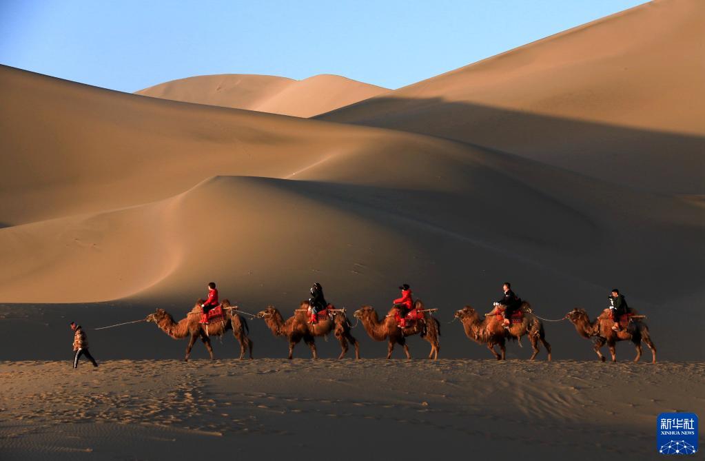 金色的鳴沙山上響起陣陣駝鈴聲,編號“414”的領(lǐng)頭駱駝和51歲的牽駝人曹文華一起帶領(lǐng)著(zhù)駝隊,馱著(zhù)游客,朝連綿起伏的沙丘深處走去。