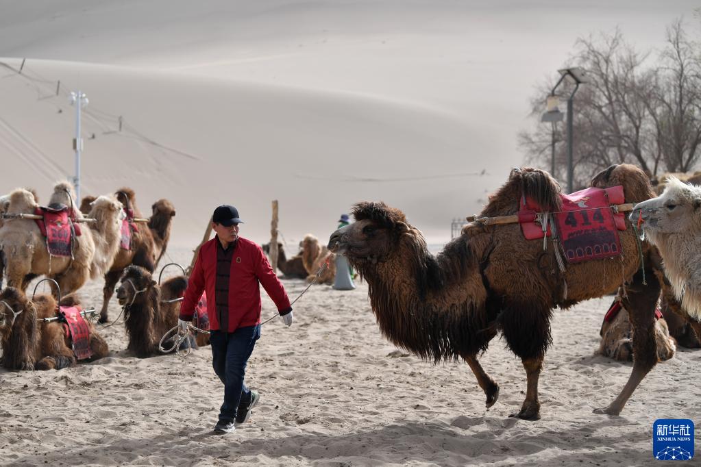 曹文華牽著(zhù)駱駝在鳴沙山月牙泉景區駱駝騎乘點(diǎn)等待游客(4月24日攝)。