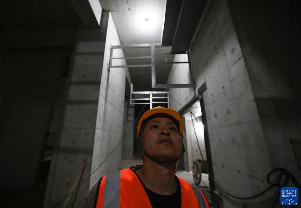 齊國超在施工現場(chǎng)查看頂上的綜合支架安裝工作(4月29日攝)。