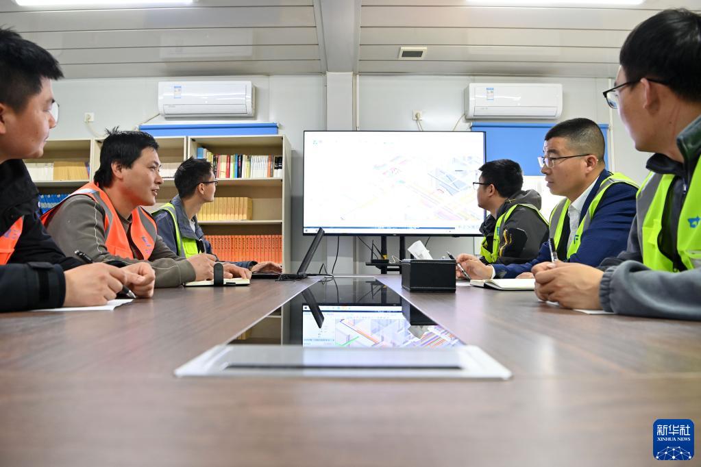 齊國超(左二)在項目部參會(huì )討論下一階段施工任務(wù)(4月26日攝)。