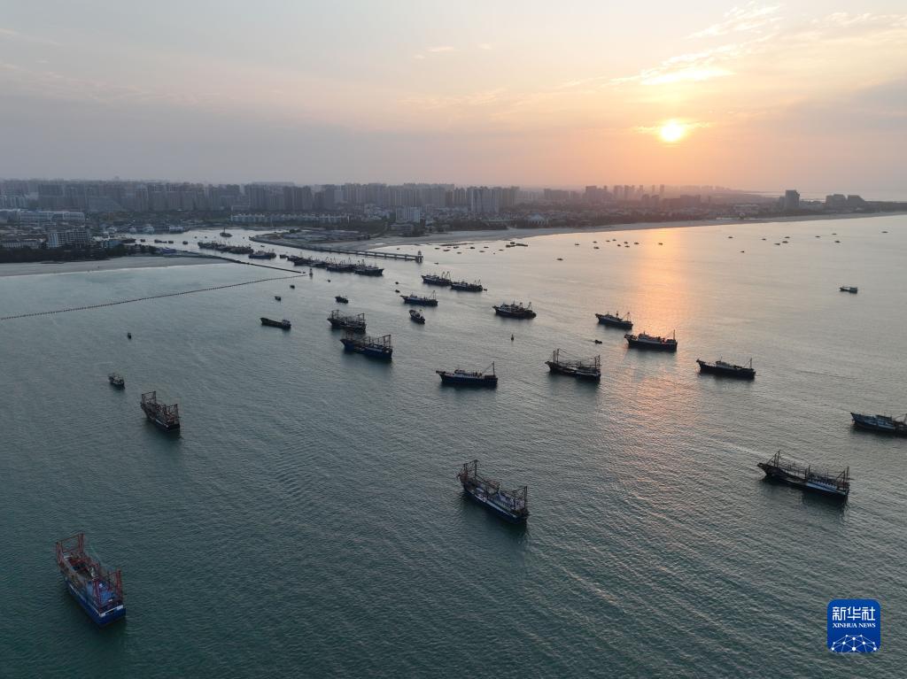 4月30日清晨,廣西北海休漁船只有序駛回銀海區電建漁港(無(wú)人機照片)。