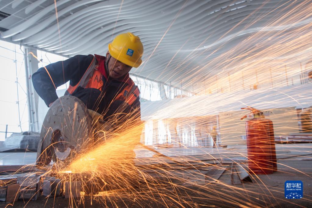 5月1日,在中建三局承建的武漢天河機場(chǎng)T2航站樓改造工程項目工地,工人在切割材料。