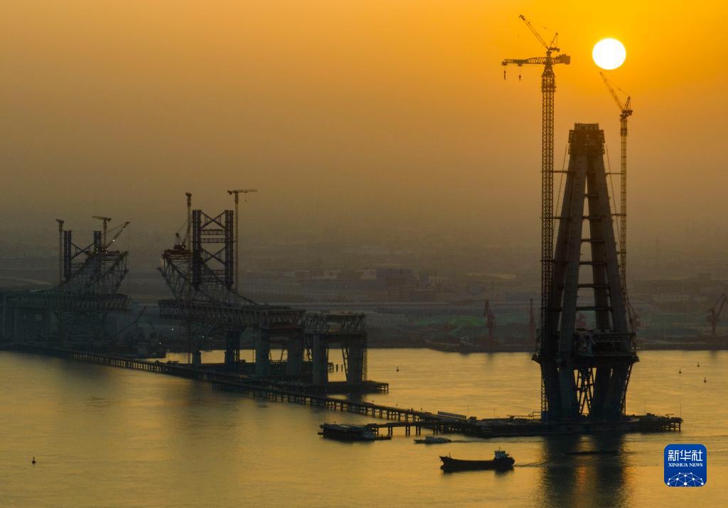 5月1日,中交二航局工人在江蘇常泰長(cháng)江大橋5號墩主塔作業(yè)(無(wú)人機照片)。
