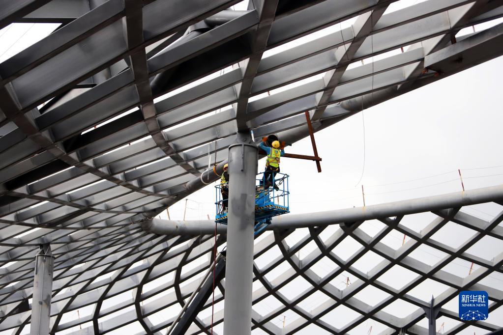 5月1日,工人在浙江省臺州市路橋機場(chǎng)改擴建項目施工現場(chǎng)施工。