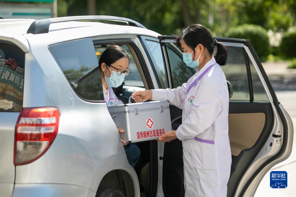 4月30日,在淄博市高青縣田鎮街道,志愿者備好常用藥品準備乘車(chē)前往一個(gè)燒烤服務(wù)點(diǎn)工作。
