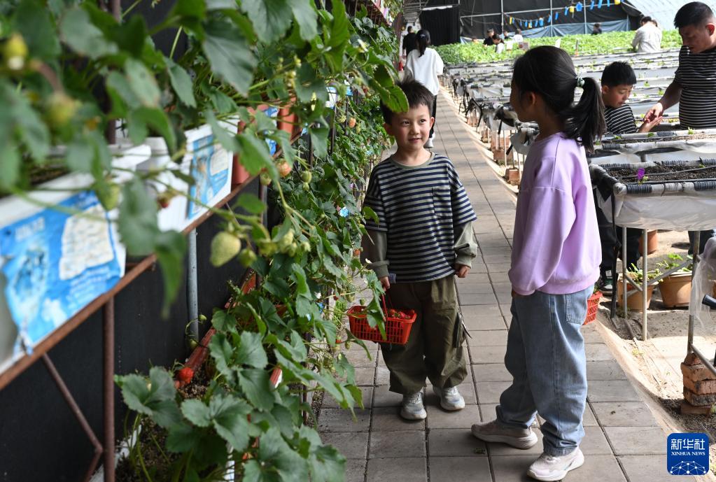 5月1日,游客在隆化縣七家鎮西道村的草莓基地大棚內采摘草莓。