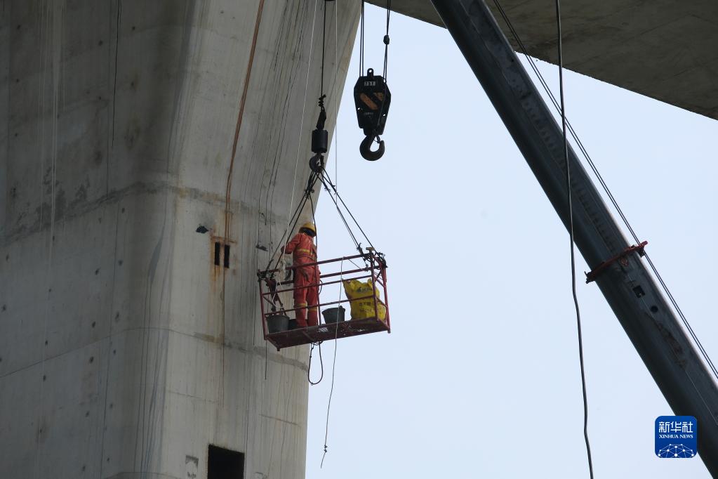 工人在廣西龍門(mén)大橋項目建設工地施工(5月1日攝)。