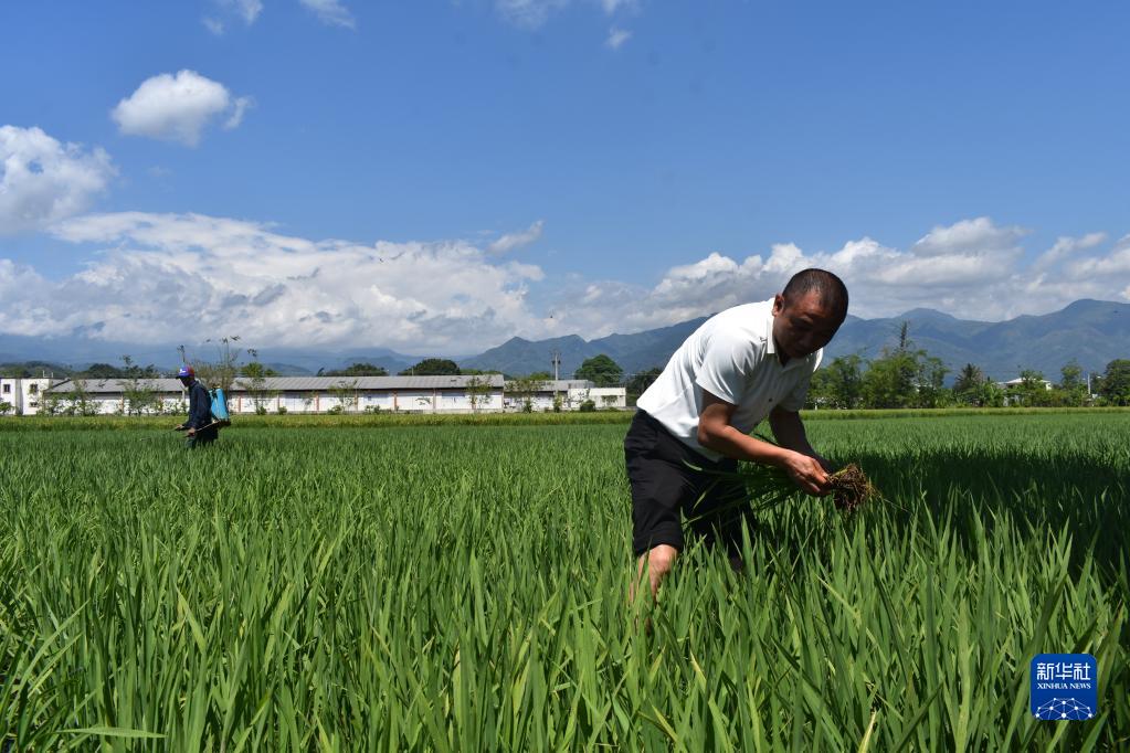 4月26日,在多米尼加首都圣多明各西北約80公里處,中國農業(yè)專(zhuān)家(前)在多米尼加國家水稻培訓中心的一片試驗田內工作。