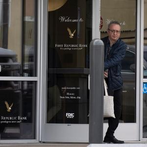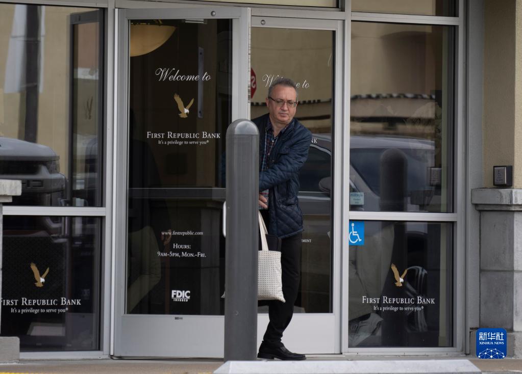 5月1日,在美國加利福尼亞州米爾布雷市,一名男子從一家第一共和銀行走出。