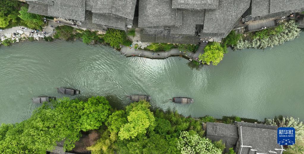 5月2日,游客在貴州省遵義市播州區烏江古寨景區乘船游玩(無(wú)人機照片)。