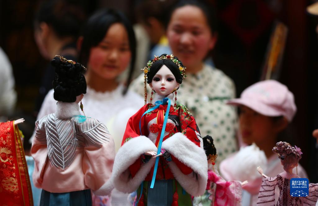 5月2日,游客在山東省滕州市“黃河大集·龍泉廟會(huì )”上欣賞玩偶。