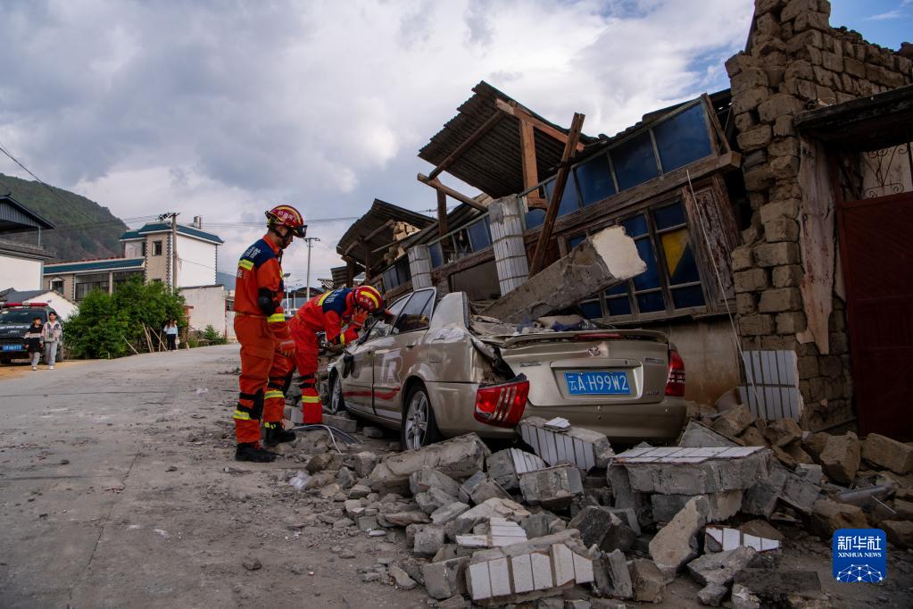 5月3日,應急救援人員在云南省保山市隆陽(yáng)區瓦窯鎮排查受損的房屋和車(chē)輛。