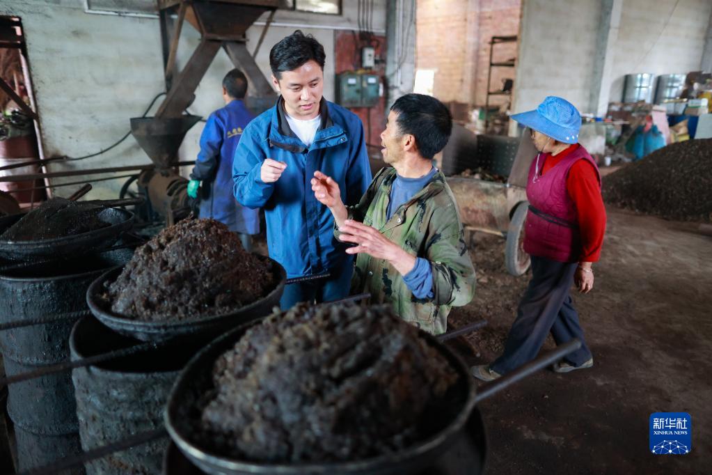 楊安仁(前左)和工人交流油桐榨油工序(4月17日攝)。