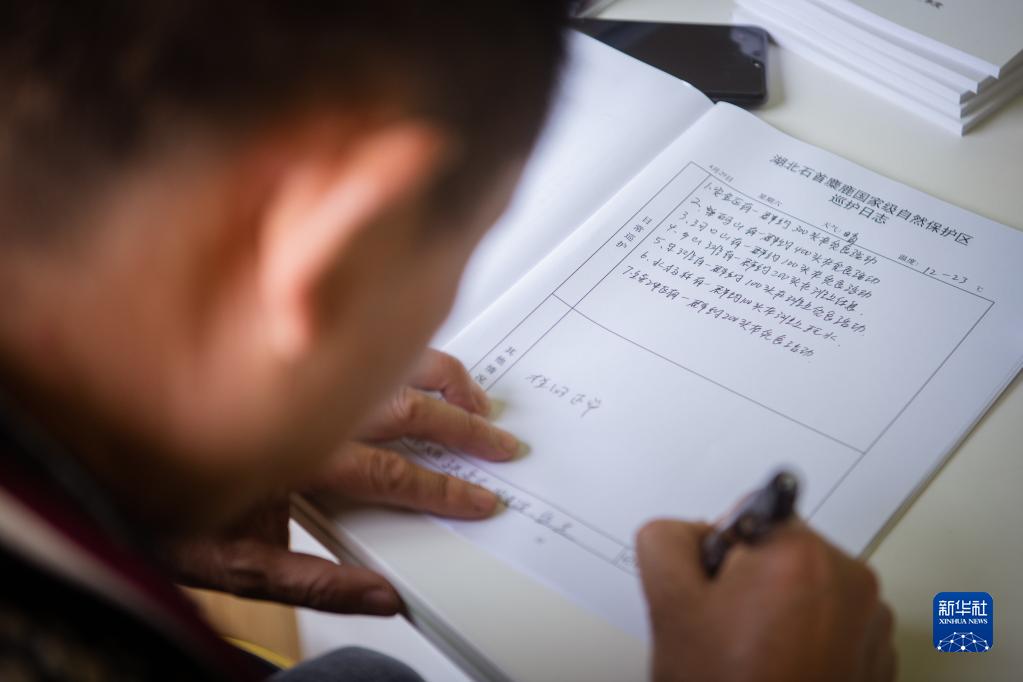 4月29日,在石首麋鹿國家級自然保護區,巡護員劉吉高填寫(xiě)巡護日志。