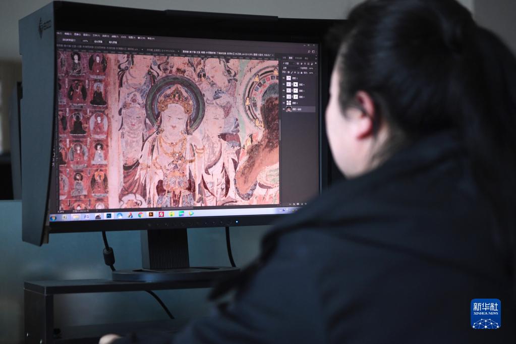 敦煌研究院文物數字化保護團隊圖像處理人員年海麗在拼接壁畫(huà)圖像(4月25日攝)。