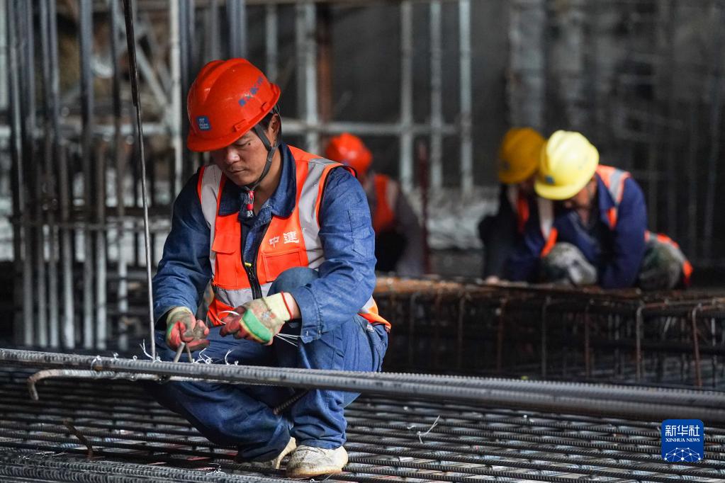 5月3日,中建八局的工人在合肥地鐵7號線(xiàn)蓮花路站工程現場(chǎng)施工。