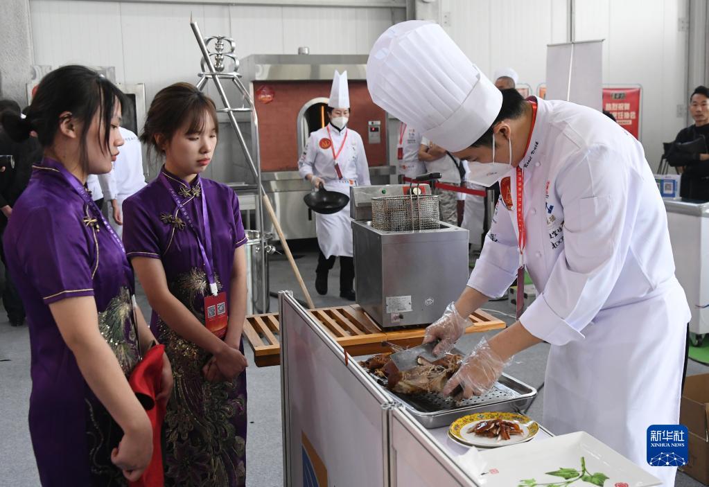 夏志鵬(右)在2023中國首屆烤鴨技能烹飪大賽中片烤鴨(4月24日攝)。