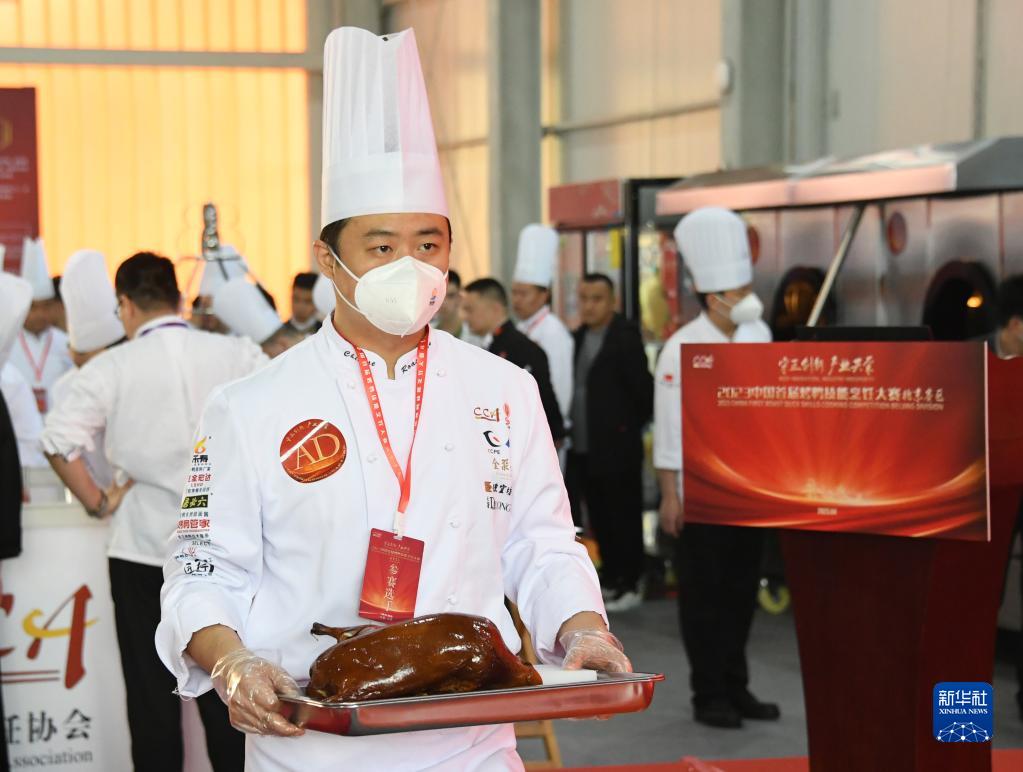夏志鵬在2023中國首屆烤鴨技能烹飪大賽中端著(zhù)烤制完成的烤鴨(4月24日攝)。