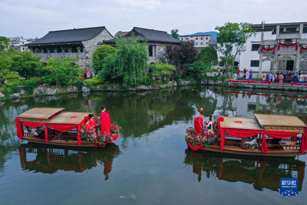 當日,浙江省建德市梅城鎮嚴州古城舉行宋韻水上婚禮表演,通過(guò)出閣、梳妝、登船、親迎、禮拜的五幕演繹,吸引了人們駐足觀(guān)禮。有著(zhù)1000多年歷史的嚴州古城地處新安江、富春江、蘭江交匯處,歷史文化積淀深厚。