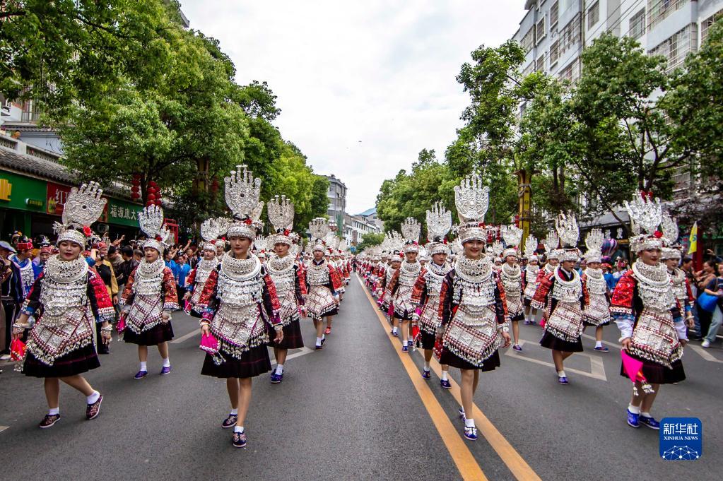 5月2日,人們在貴州省臺江縣參加苗族姊妹節盛裝巡游。