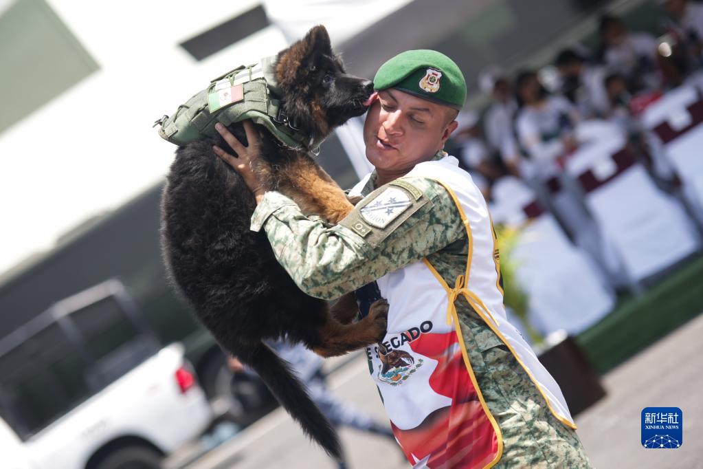 5月3日,在墨西哥瑙卡爾潘一處軍事基地,訓導員抱著(zhù)土耳其贈送的小狗。