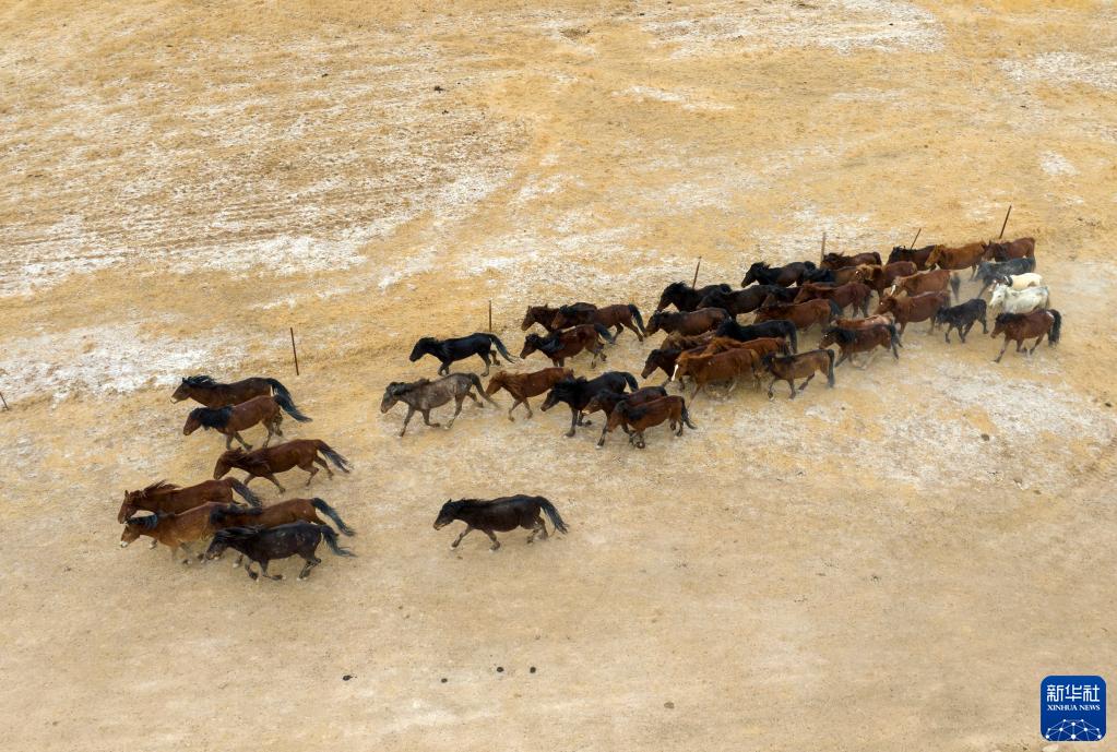 5月3日,在阿克塞縣阿伊納鄉海子草原,馬群轉場(chǎng)去往夏季牧場(chǎng)(無(wú)人機照片)。