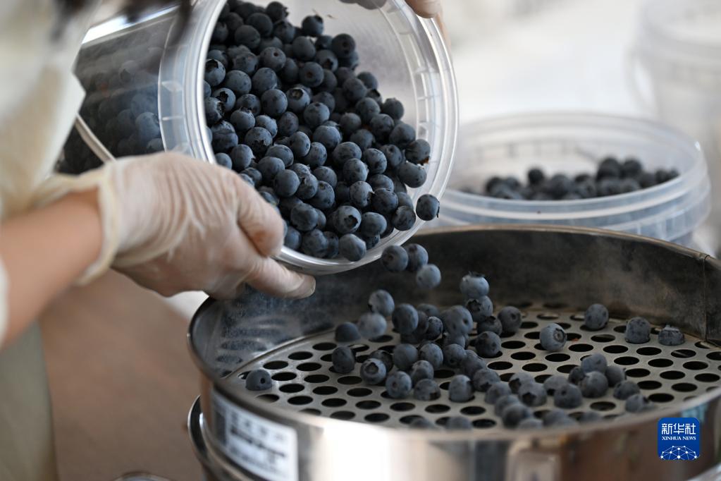 呂欣在挑選藍莓準備包裝(5月3日攝)。