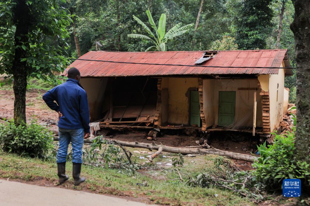 5月4日,居民站在盧旺達西方省一處受損的房屋旁。