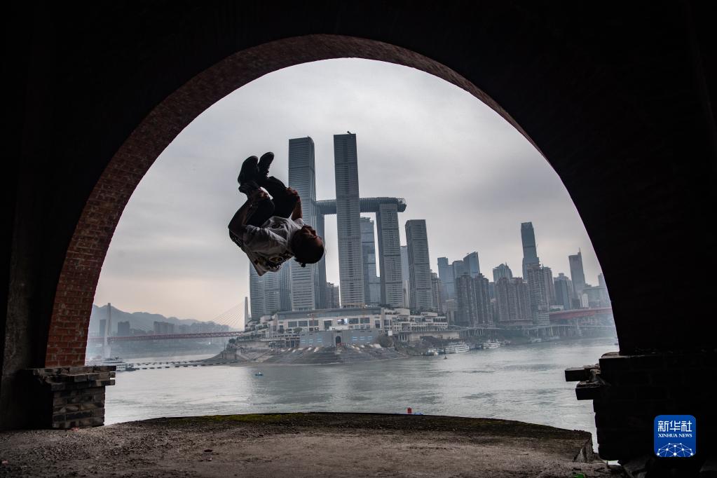 2023年4月21日,重慶躍飛跑酷隊員文舜堯在重慶朝天門(mén)對岸的南濱路上展示跑酷動(dòng)作。