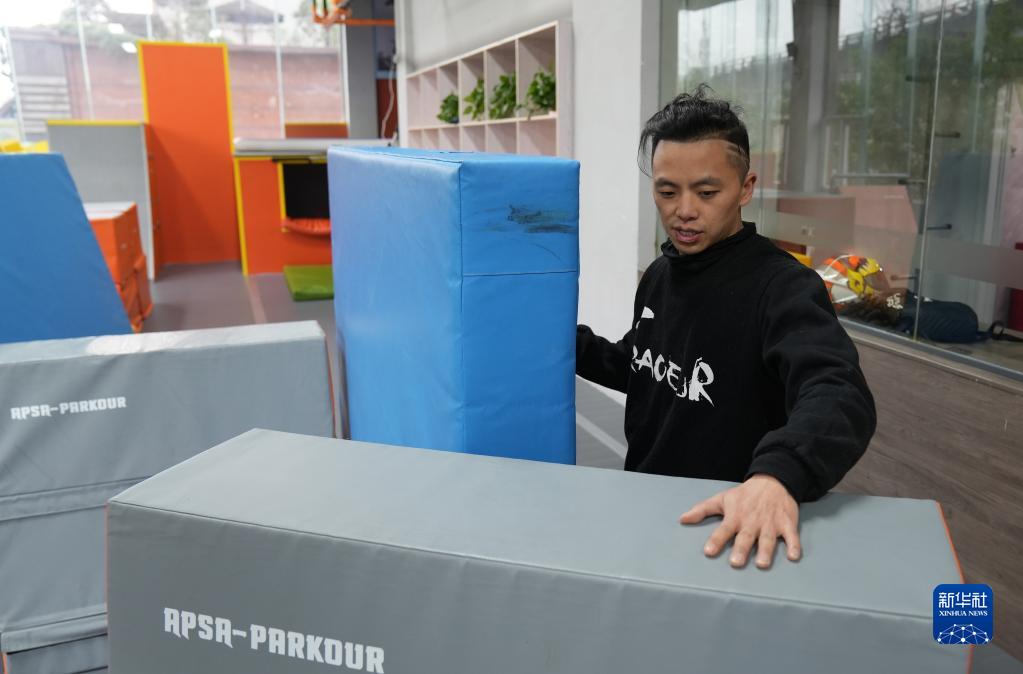 2023年2月23日,文舜堯在重慶躍飛跑酷俱樂(lè )部?jì)葦[放訓練器材。