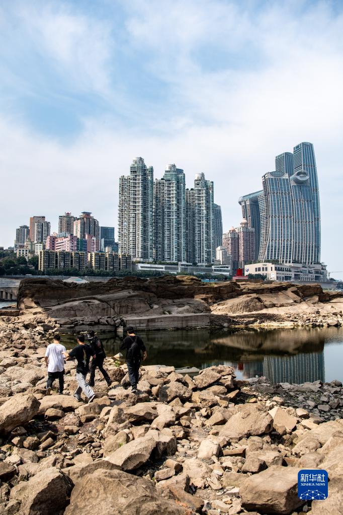 2023年3月14日,重慶躍飛跑酷隊員們在重慶東水門(mén)長(cháng)江大橋下的江心礁石上尋找跑酷路線(xiàn)。