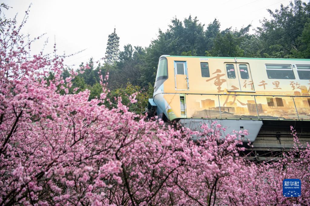 2022年2月20日,重慶軌道二號線(xiàn)列車(chē)從花叢中穿過(guò)。