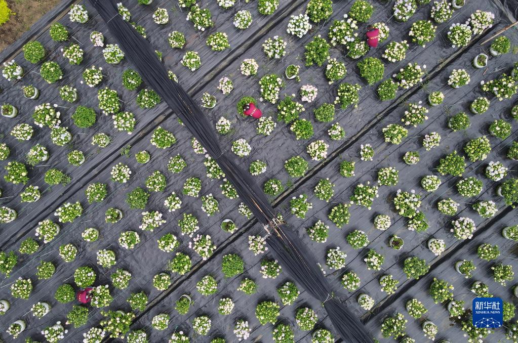 5月5日,在肥西縣經(jīng)開(kāi)區一家農林科技企業(yè),員工在打理繡球花(無(wú)人機照片)。