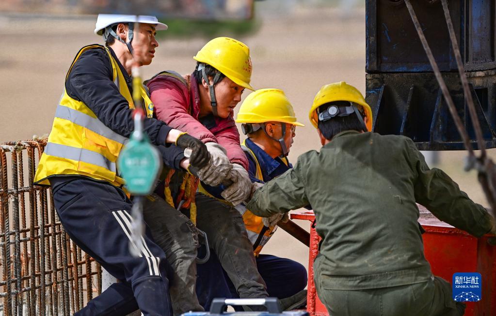 5月5日,建設者在包銀高鐵跨萬(wàn)甘鐵路特大橋箱梁架設施工現場(chǎng)作業(yè)。