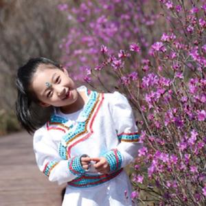 5月6日,小朋友在達爾濱湖國家森林公園與杜鵑花合影。