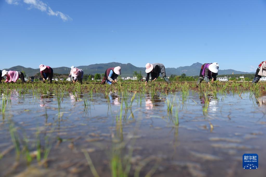 5月6日,農民在云南省麗江市古城區金山街道東元社區的農田里插秧。