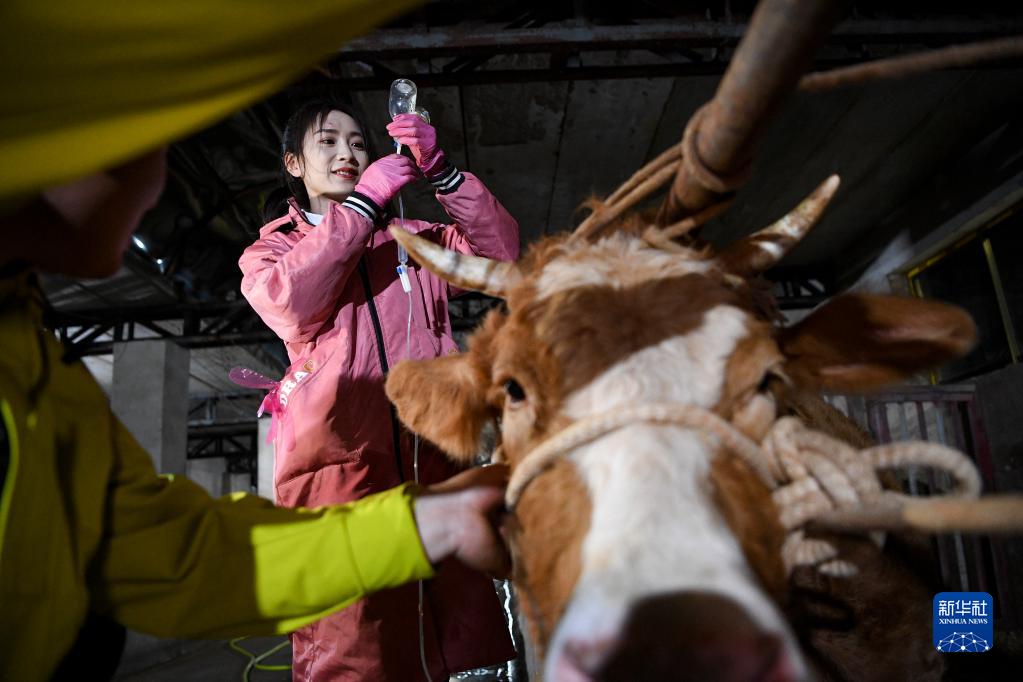 晚上10點(diǎn)多,白婳在固原市原州區開(kāi)城鎮和泉村為一頭牛輸液(4月17日攝)。