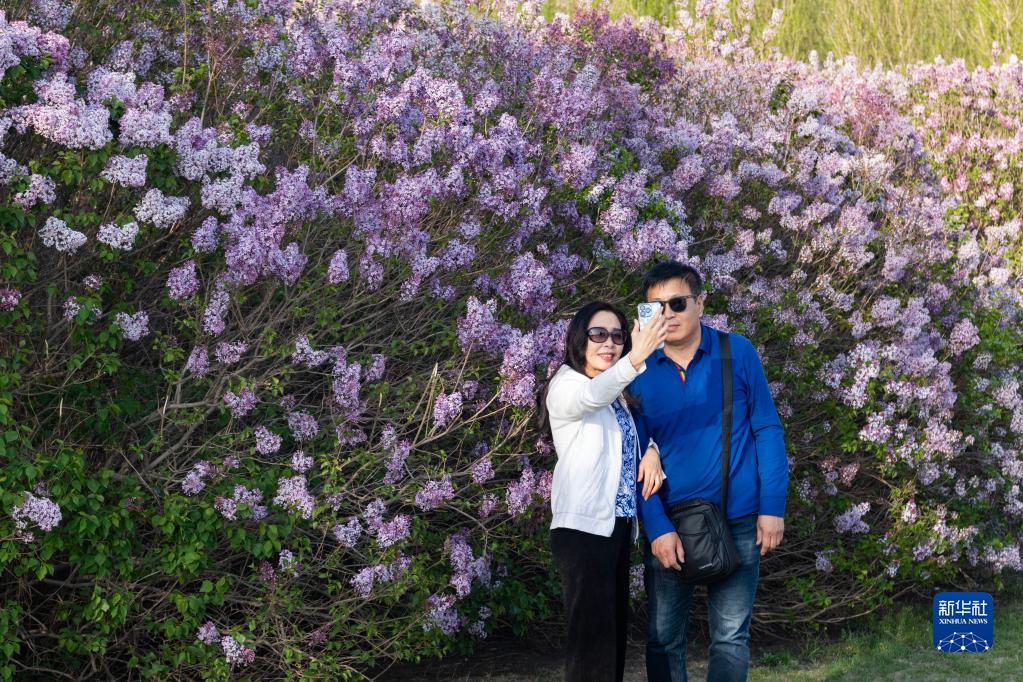 5月6日,游客在哈爾濱丁香公園賞花拍照。
