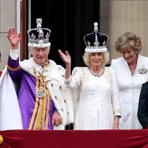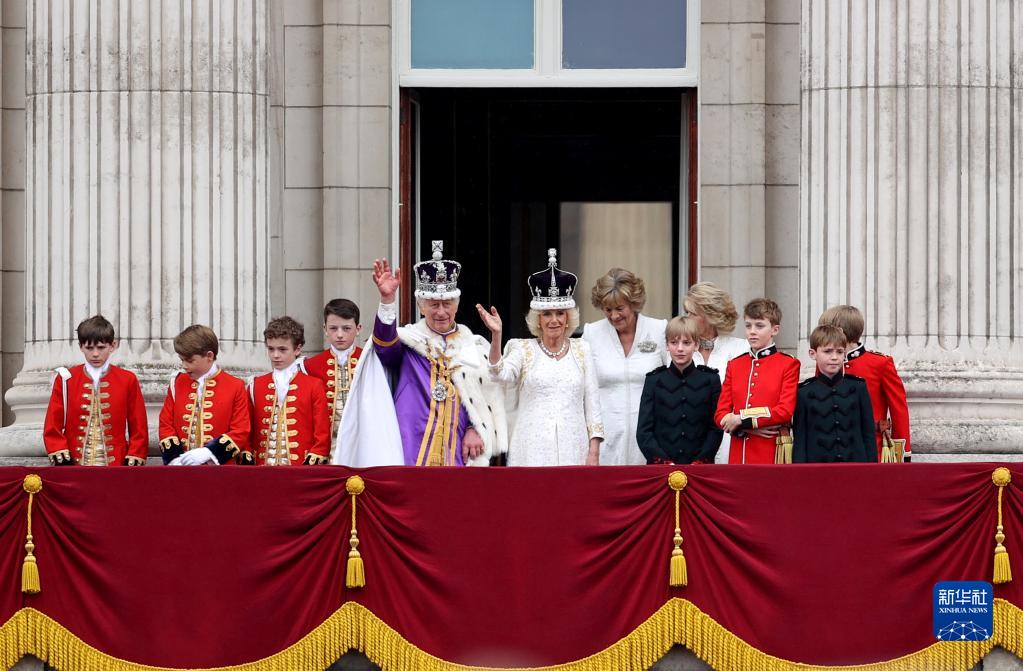 5月6日,在英國倫敦,英國國王查爾斯三世和王后卡米拉加冕后在白金漢宮陽(yáng)臺向民眾揮手致意。