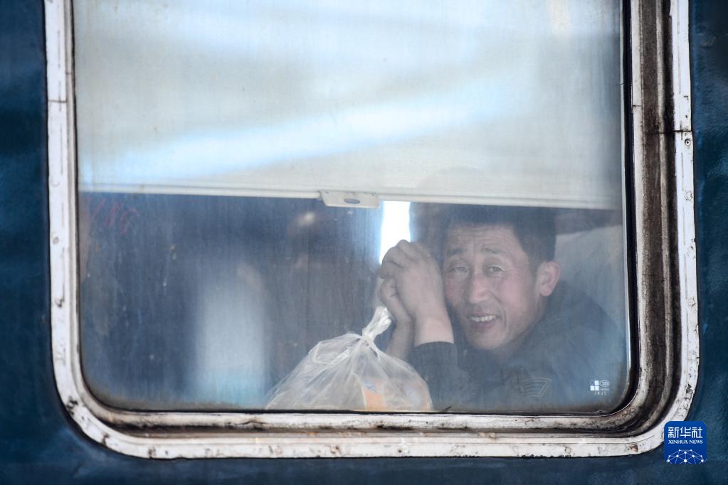 在K5151次列車(chē)車(chē)廂中,一位乘客在座位上望向窗外(5月6日攝)。